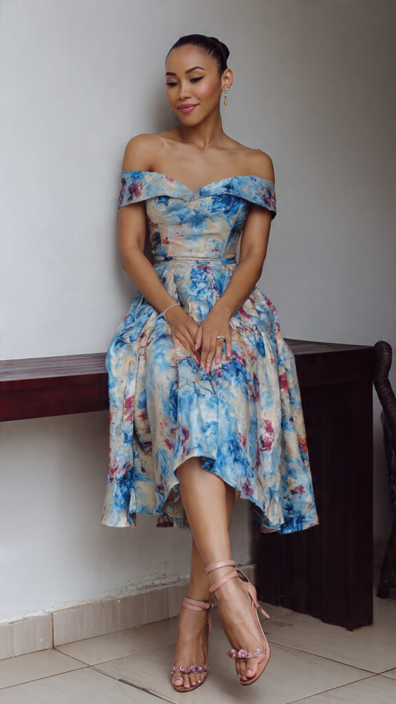 10) Off-Shoulder Printed A-Line Dress + Ankle Heels