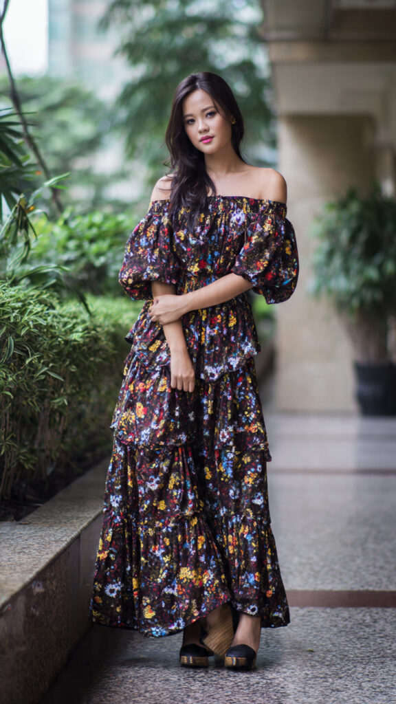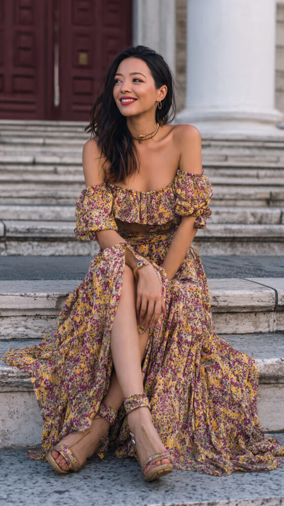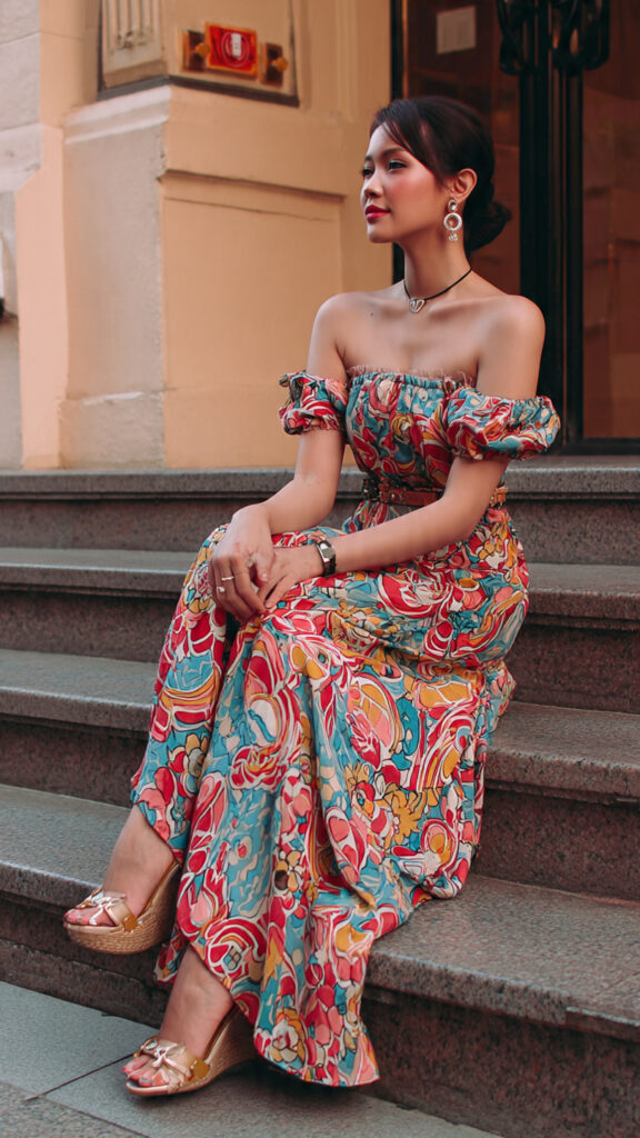 2) Off-Shoulder Printed Long Dress + Wedge Platforms