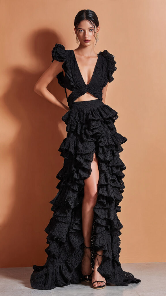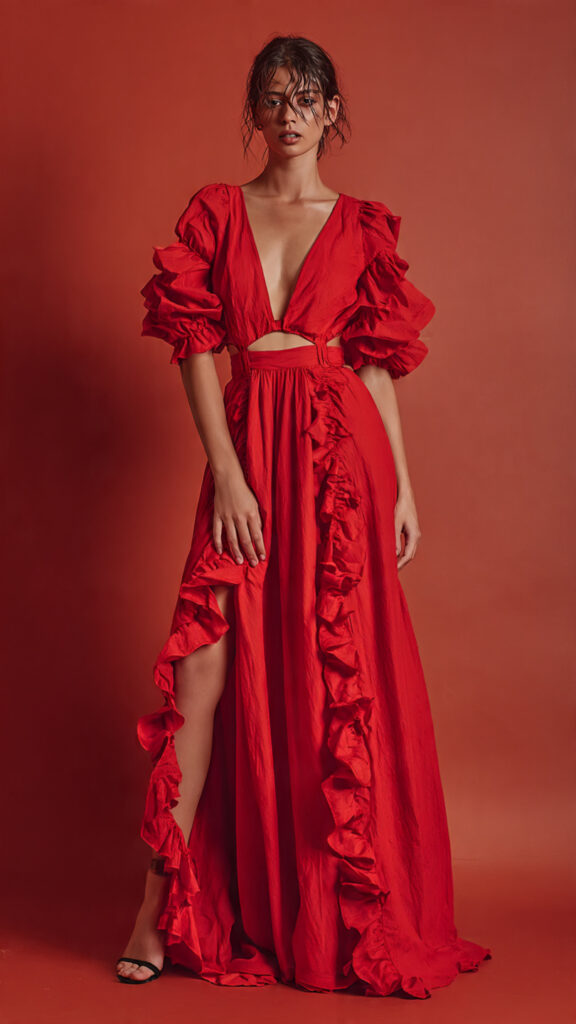 6) V-Neck Long Cut-Out Frill Dress