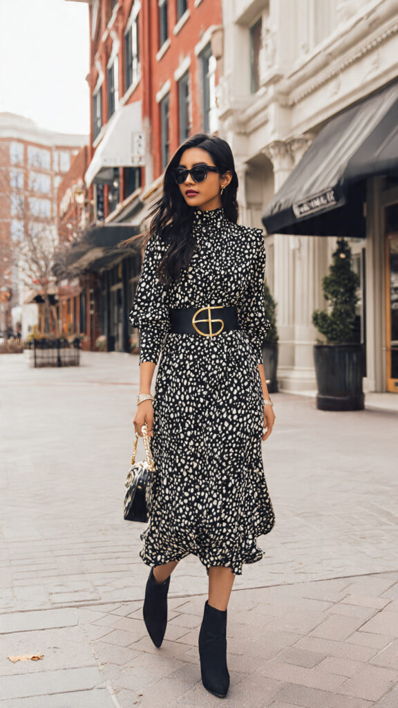 A belted midi dress creates shape without squeezing, and ankle boots ground the look. I love this for fall and transitional weather. Ever notice how a belt instantly upgrades a dress? Magic.