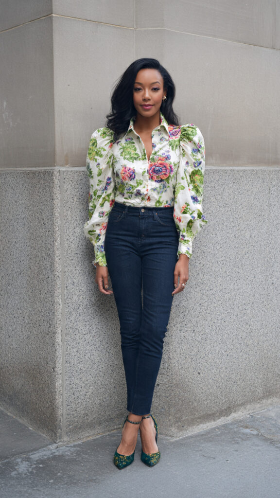 A statement blouse with interesting sleeves or texture adds focus up top. Dark jeans keep things streamlined. I wear this when I want polish without a full outfit overhaul.