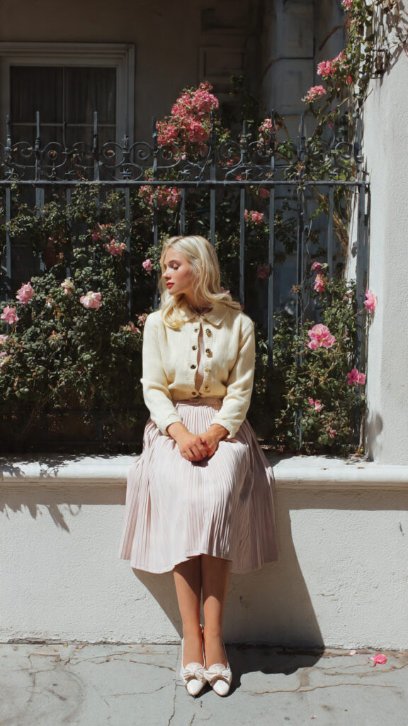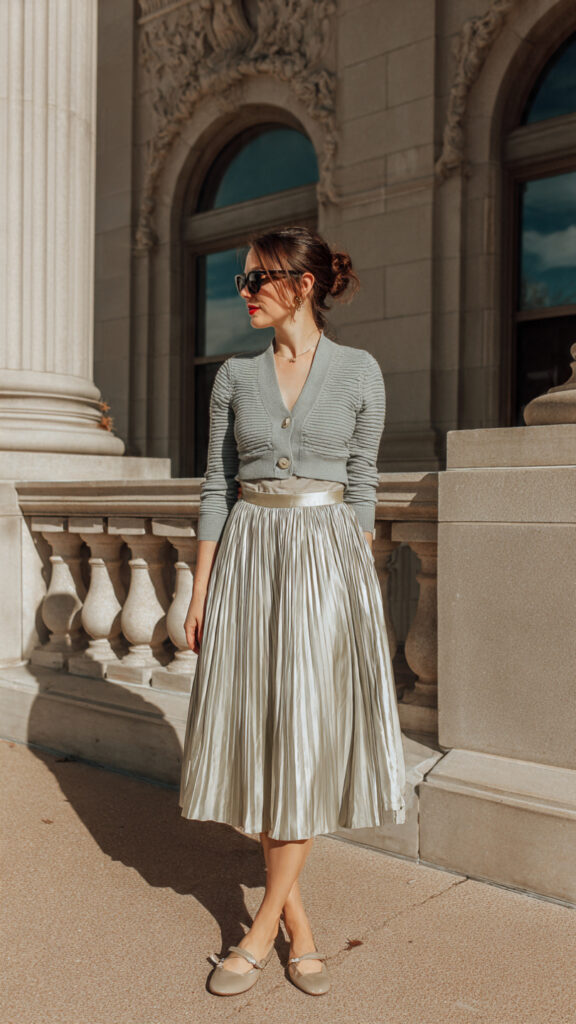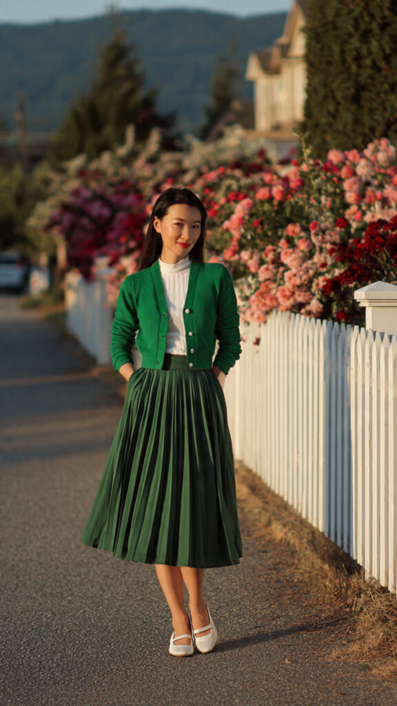 The pleated skirt gives movement, the cropped cardigan keeps the waist defined, and Mary Janes bring the cute factor.