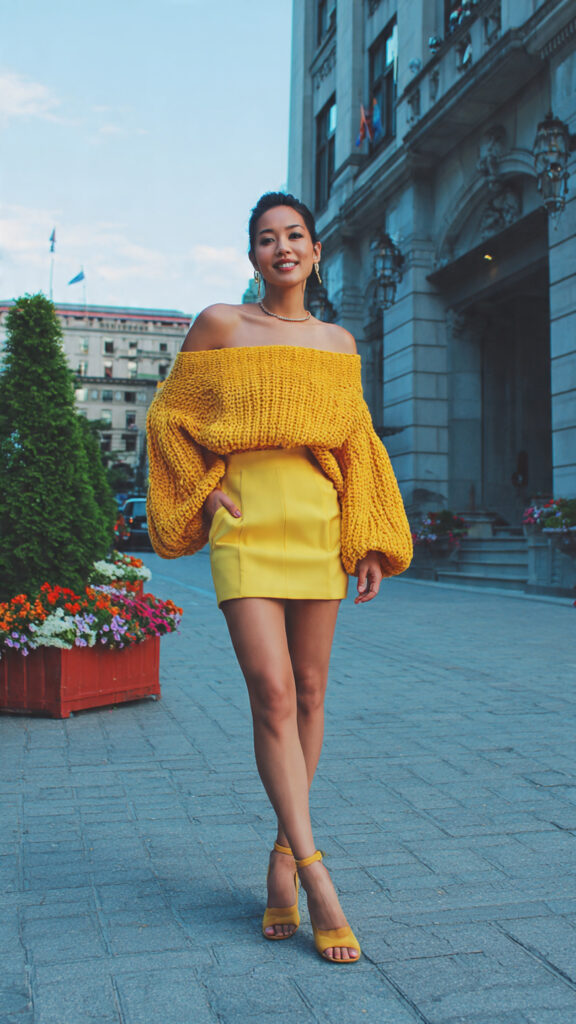 The knit feels soft and flirty, the mini skirt adds movement, and heeled mules give you height without feeling too formal.