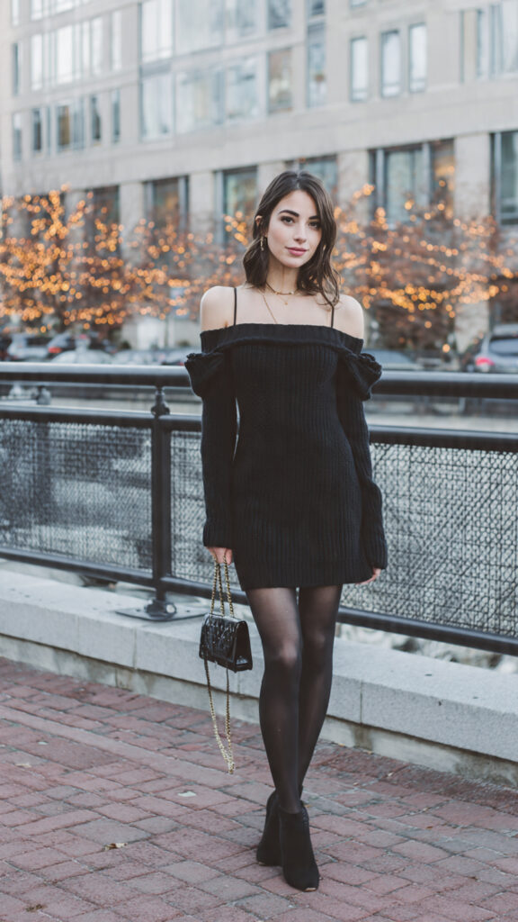 The off-shoulder neckline gives just enough skin, and tights make the whole look feel refined. Add delicate heels and you’ve got an easy date-night outfit.