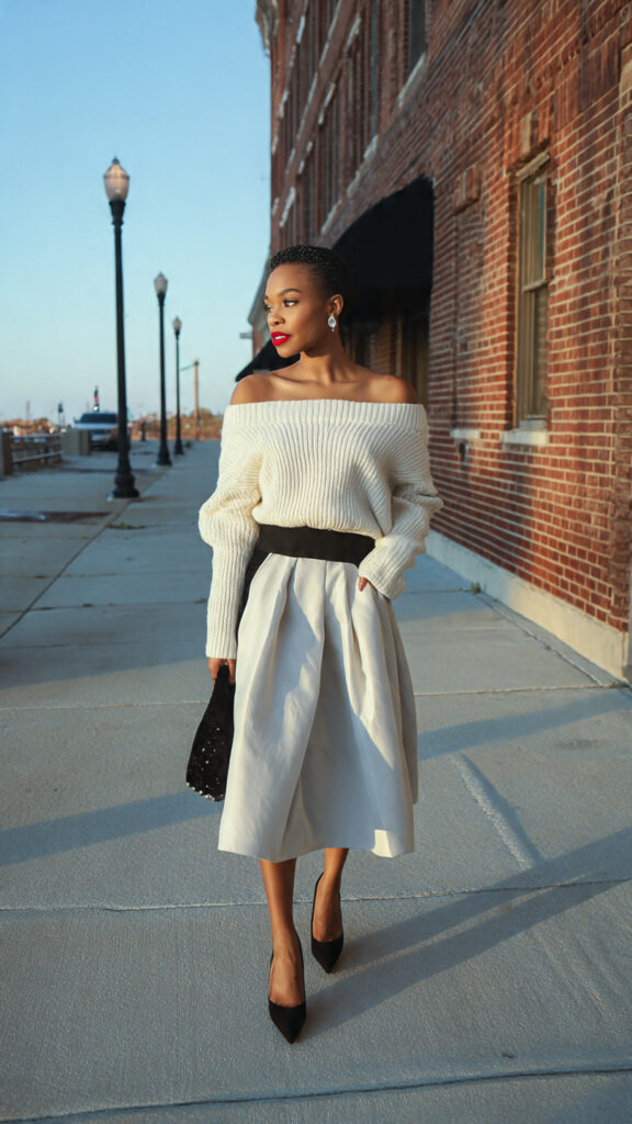 13) Off-Shoulder Sweater + Flowy Skirt + Pointed-Toe Heels