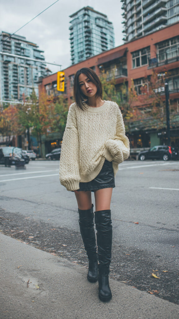 12) Oversized Sweater + Faux Leather Mini Skirt + Knee-High Boots