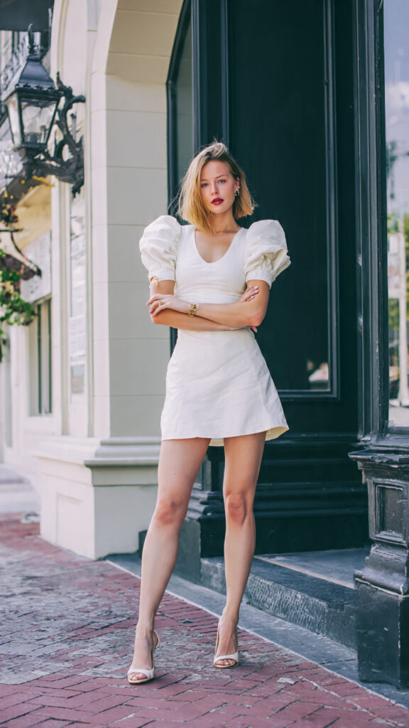 A puff-sleeve mini dress does the styling for you. You put it on and you’re done.