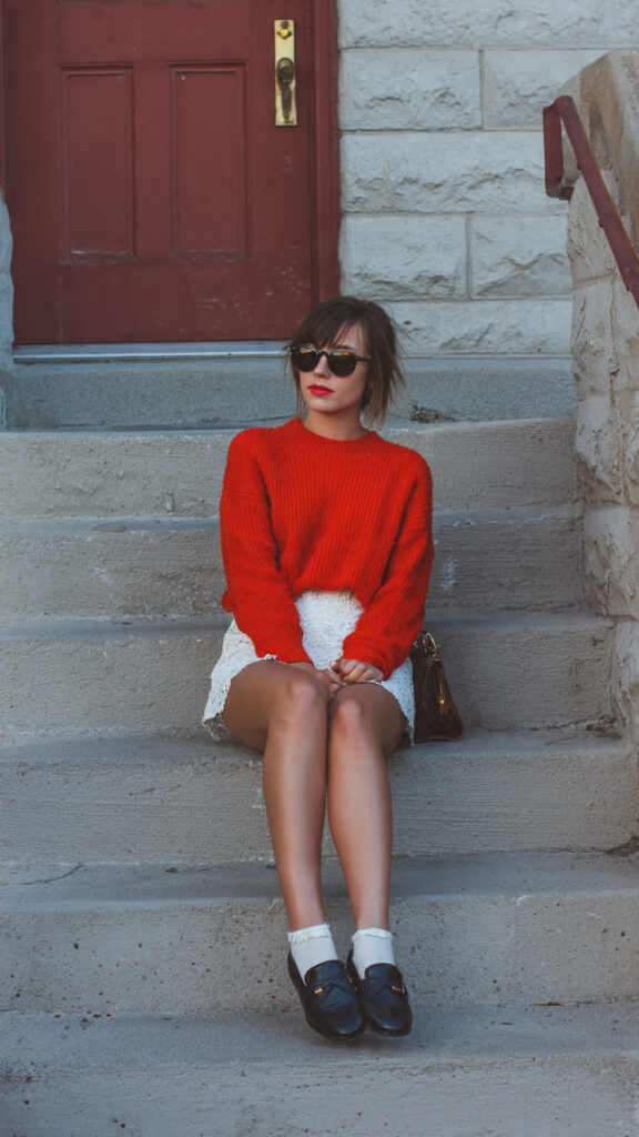 1) Red Sweater + Lace Mini Skirt + Loafers