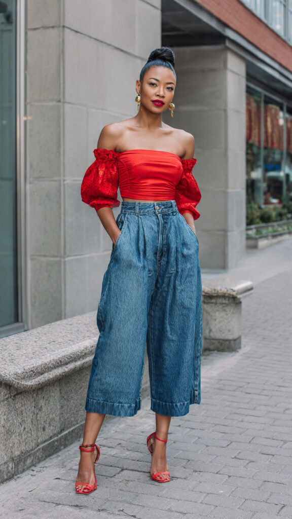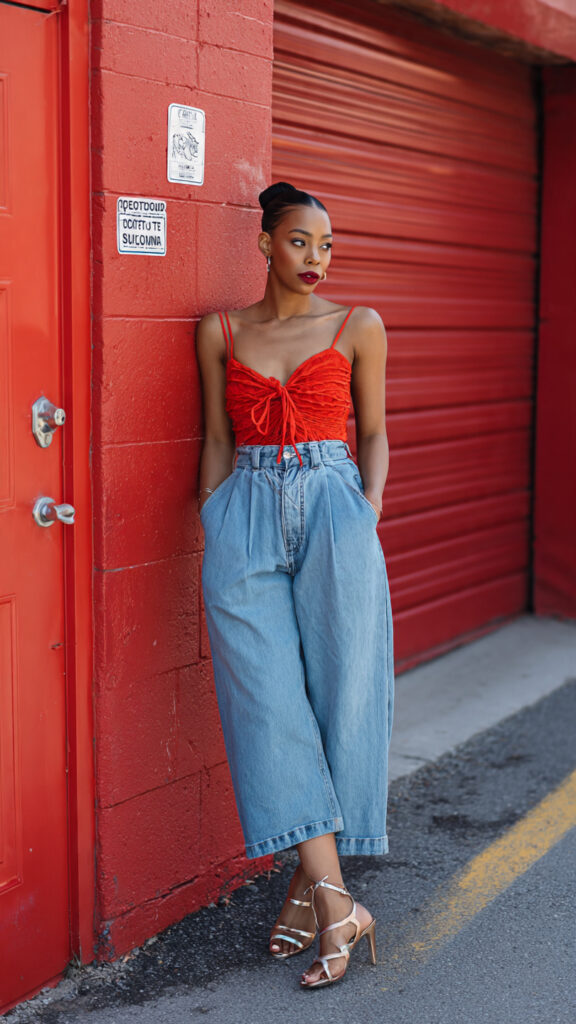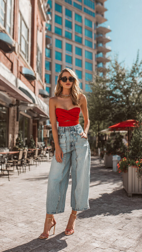 The red top brings the moment, the wide-leg jeans keep it relaxed, and strappy heels make it look intentional.