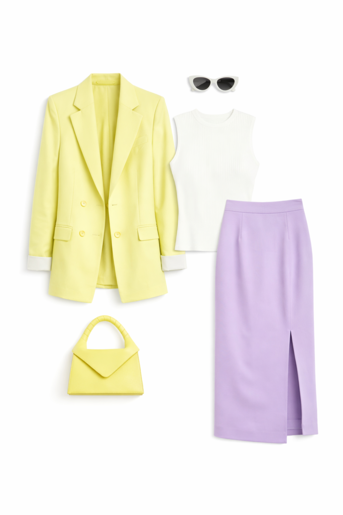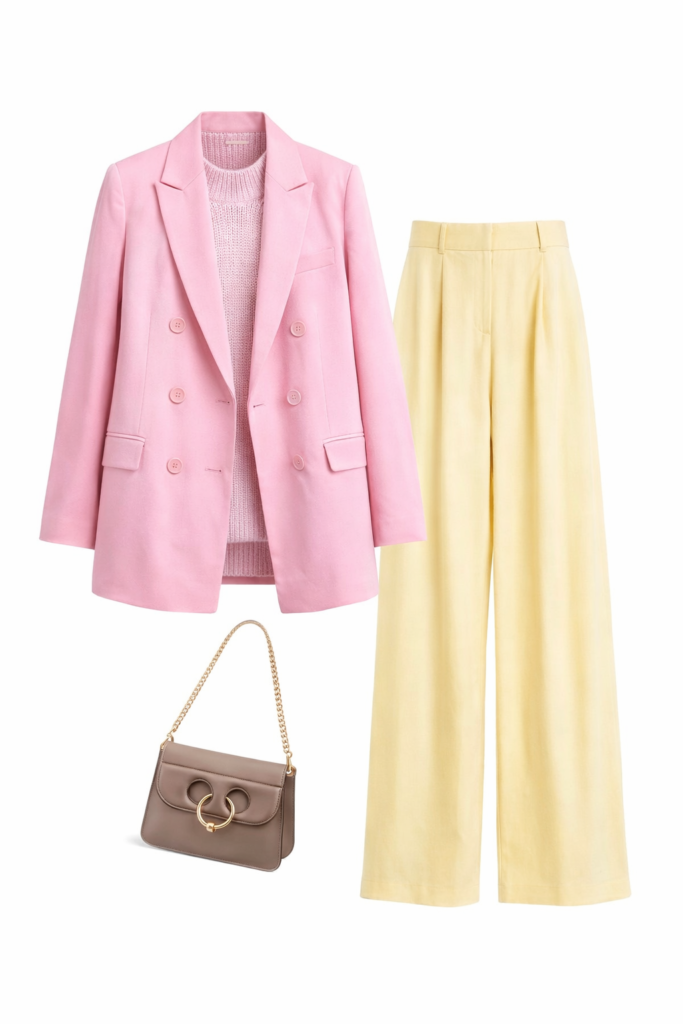 This outfit screams optimism—in the best way. Pink and yellow feel playful, but the tailoring keeps it grown.
