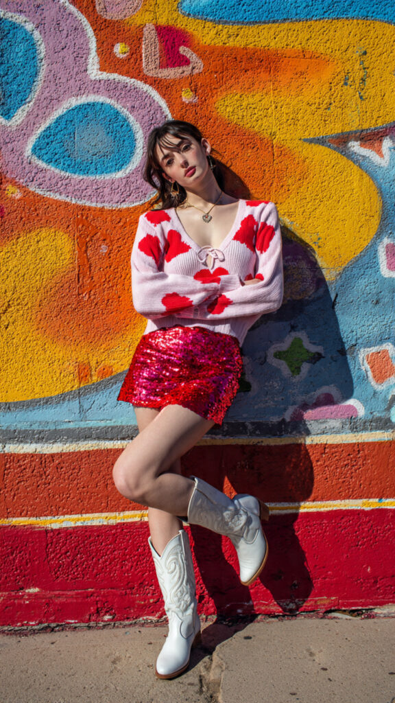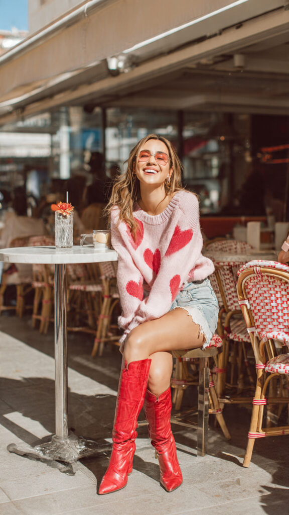 This outfit screams Galentine’s brunch. Soft sweater, casual denim, and those red boots doing all the talking.