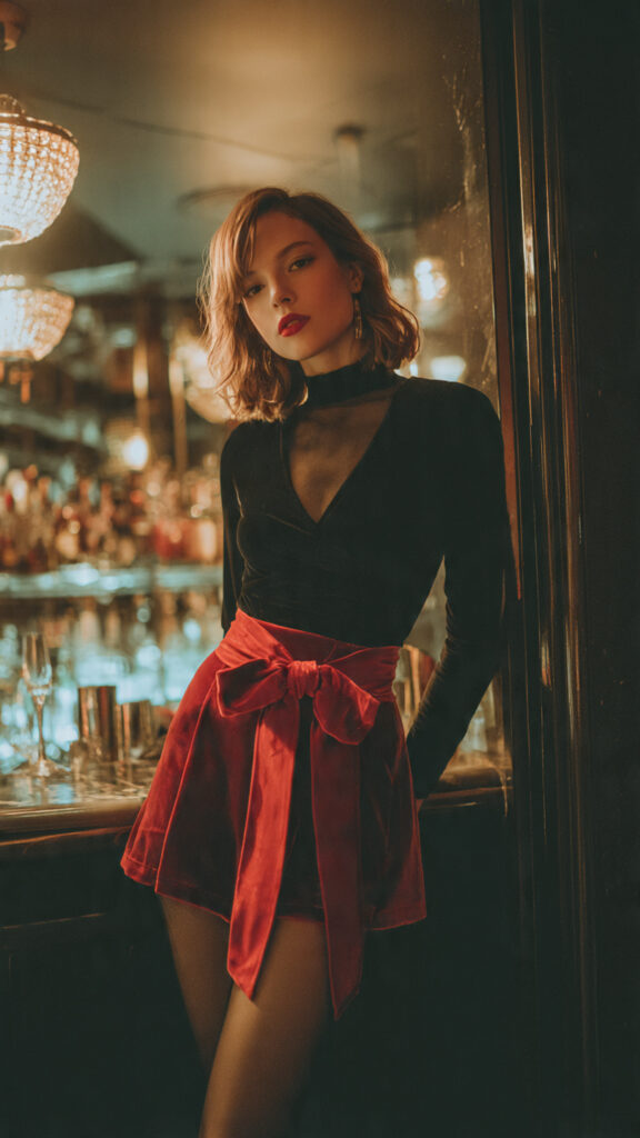 3. Black Velvet Top + Red Bow Skirt