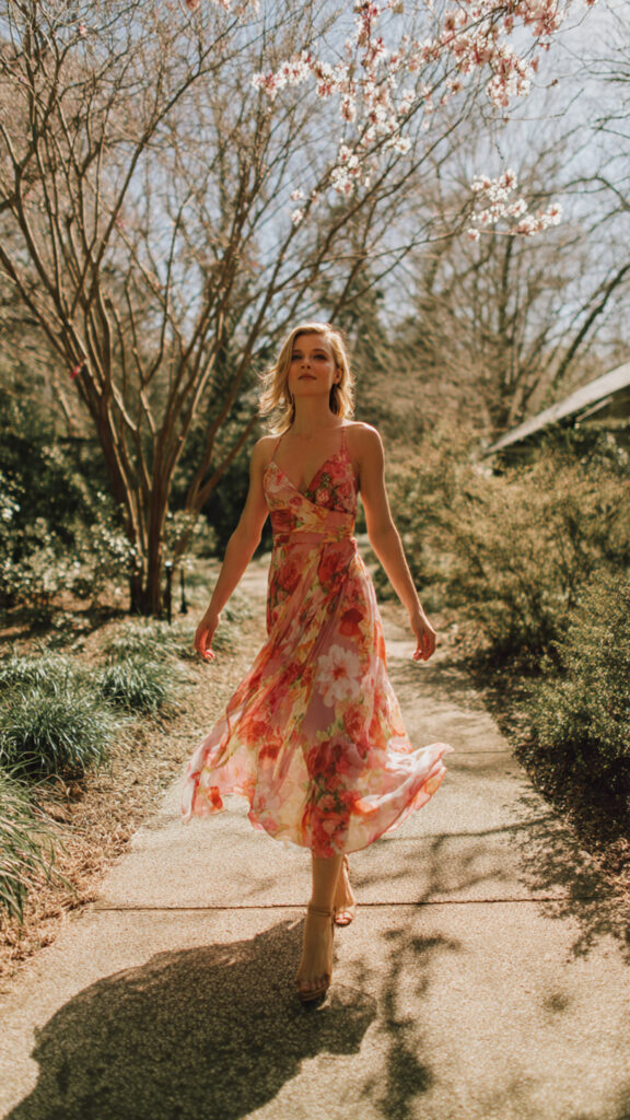 Elegant but still fun. The slit, the florals, the heels—it all just clicks.