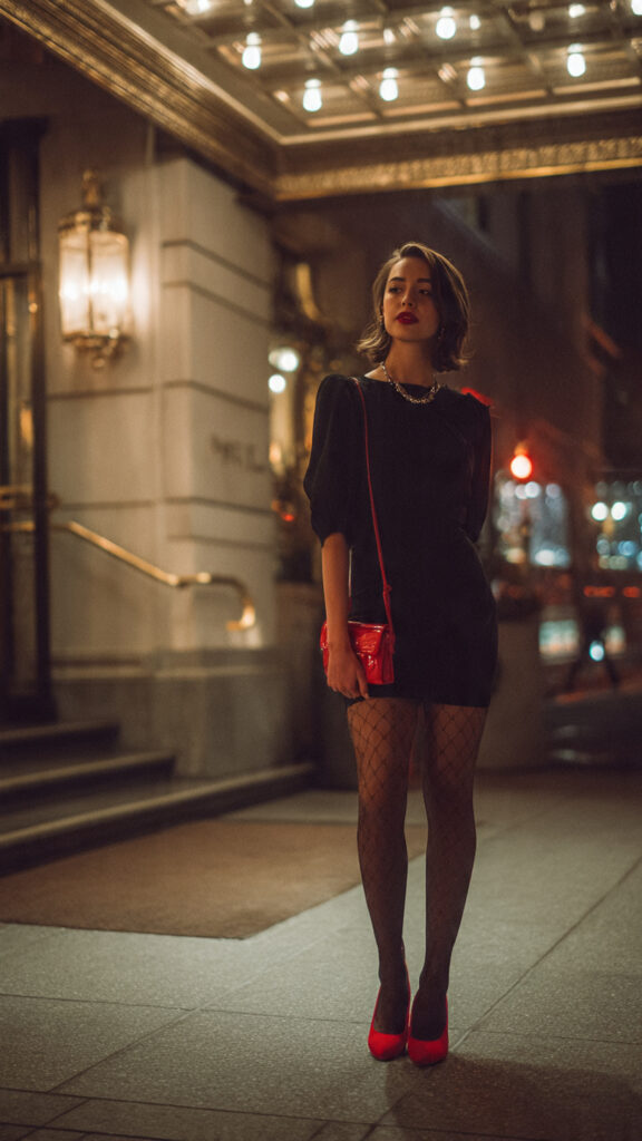 Classic LBD, sheer tights, red heels, red mini bag.
