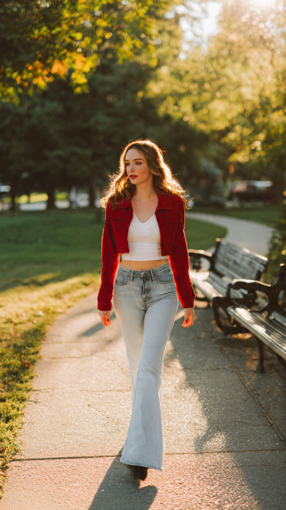 Cropped red jacket, white tee, classic flares. Easy, comfy, and still festive.