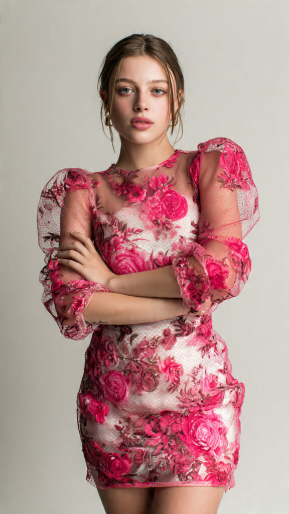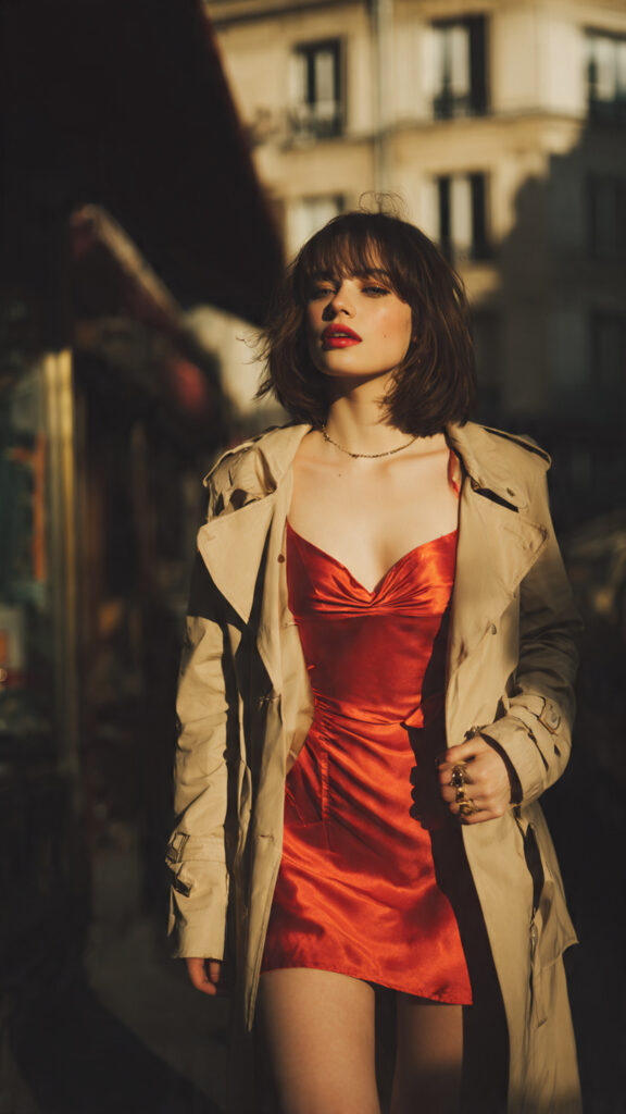 This outfit knows it’s photogenic. The bubble hem is flirty, the satin shines under flash, and the neutral trench keeps it balanced.
