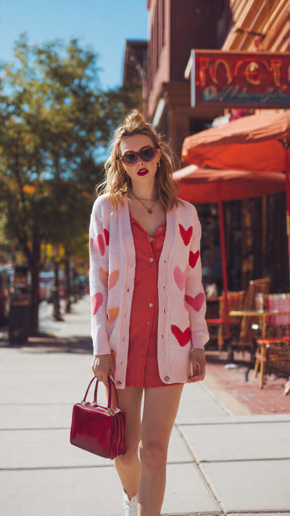 The corset keeps it flattering, the cardigan softens the look, and the color combo screams Galentine’s.