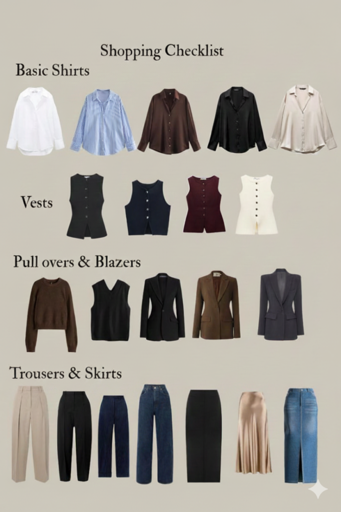 - 2–3 neutrals (black, white, beige, grey, navy)