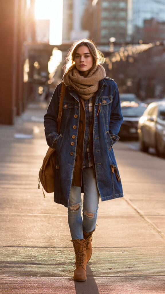 A denim jacket, trench coat, or lightweight coat covers most seasons and outfits.