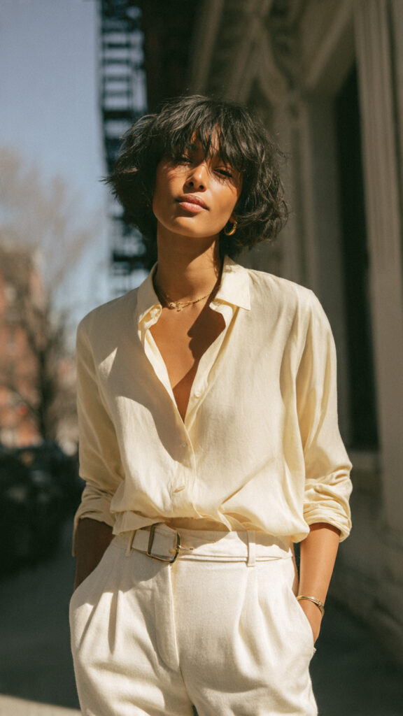 A crisp button-down paired with tailored pants or jeans handles workdays, errands, and casual plans.