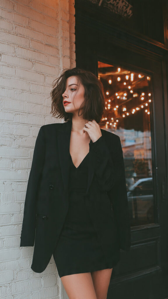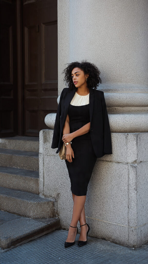 A fitted black dress anchors the look. An oversized blazer adds power without killing comfort.