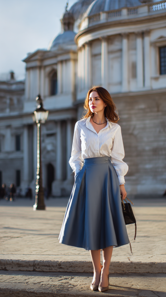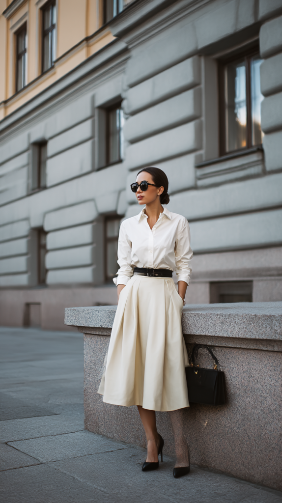 6. Elegant Midi Skirt + Structured Shirt