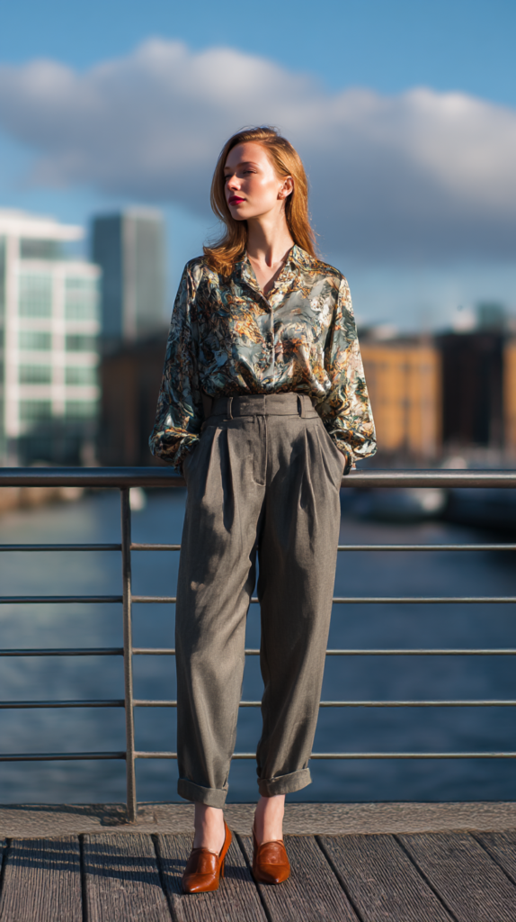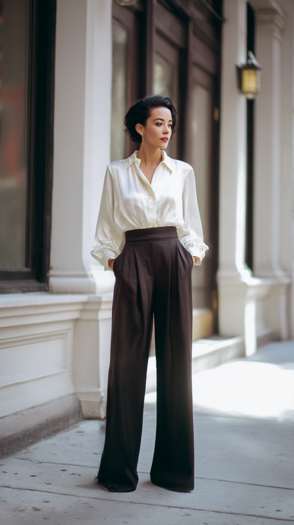 Wide-leg or cigarette trousers paired with a satin or silk blouse always look intentional.