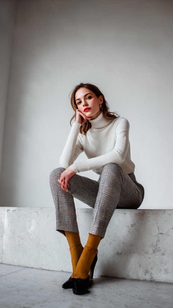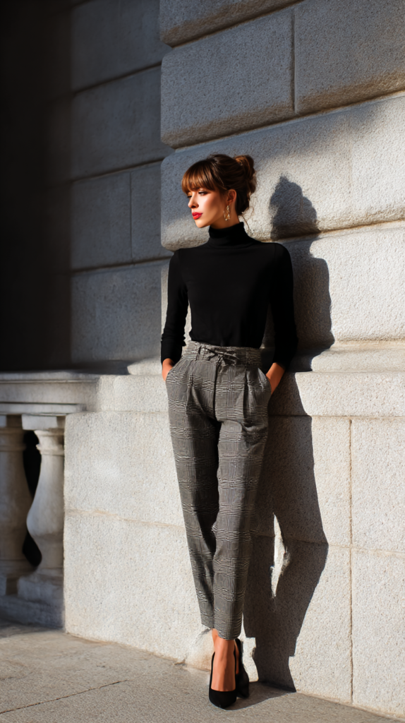 Pair tailored trousers with a turtleneck or fine cashmere sweater. Loafers or block-heel ankle boots keep it practical.
