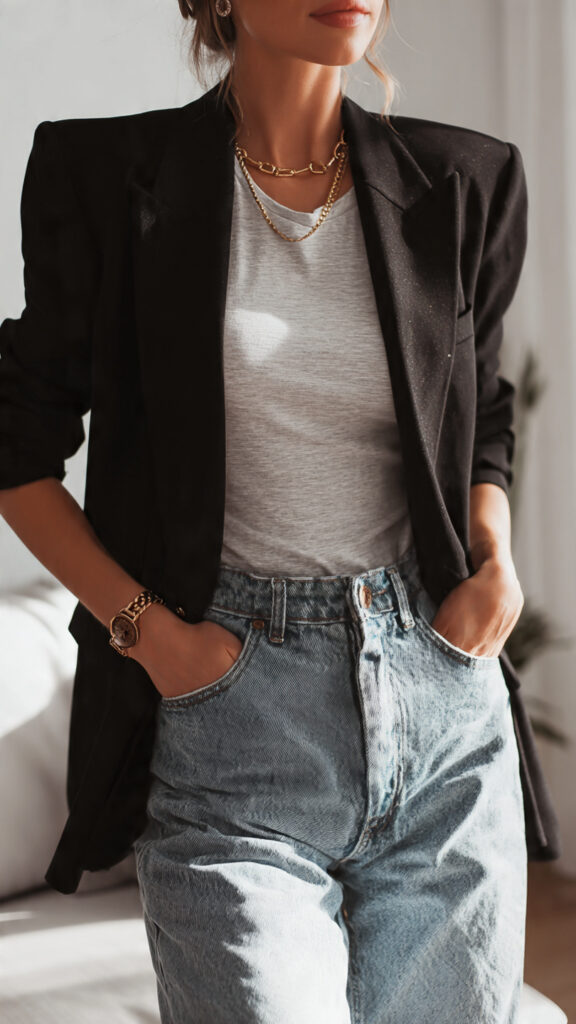 A structured blazer over a simple long-sleeve top paired with loose denim creates instant polish. The layers add coverage naturally.