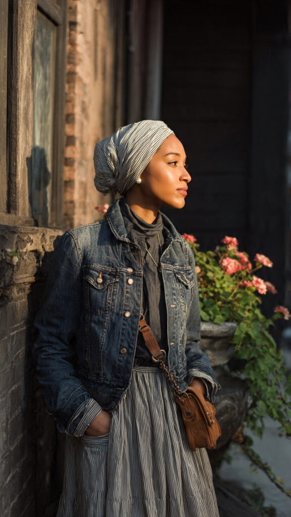 I throw a classic denim jacket over long dresses, tunics, or wide-leg outfits. It adds structure without heaviness.