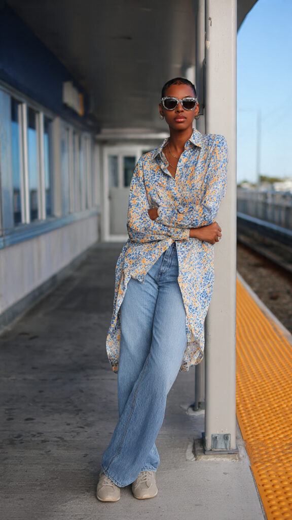 A longline button-down shirt layered over straight-leg jeans gives coverage without bulk. Cotton or linen fabrics keep it light and breathable.