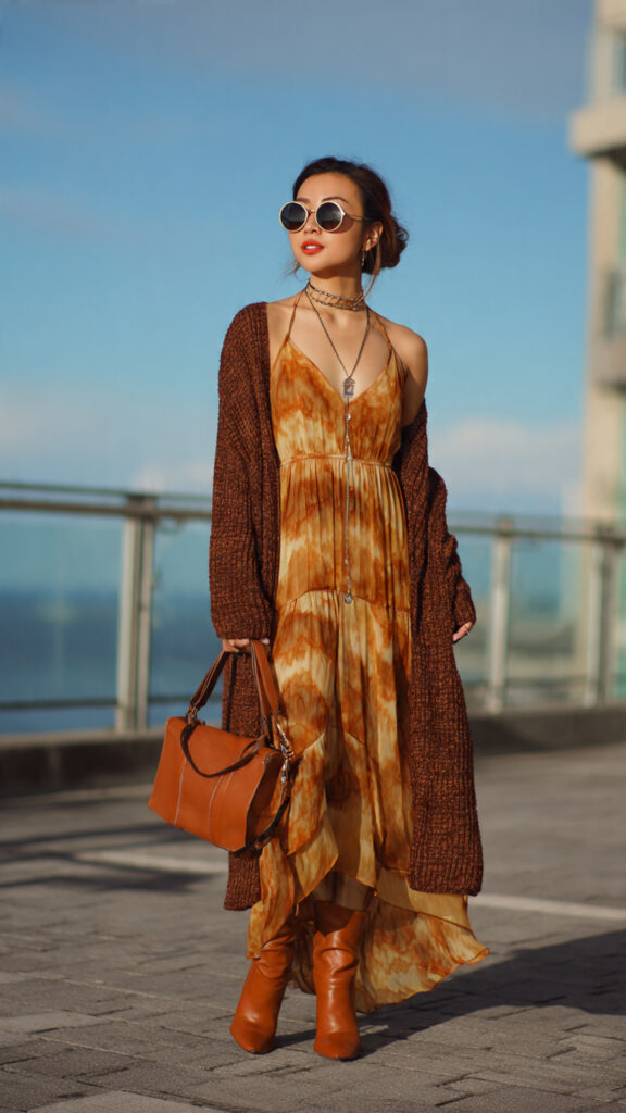 A flowy maxi dress paired with a cardigan, blazer, or denim jacket solves outfit planning instantly. One piece, zero effort.