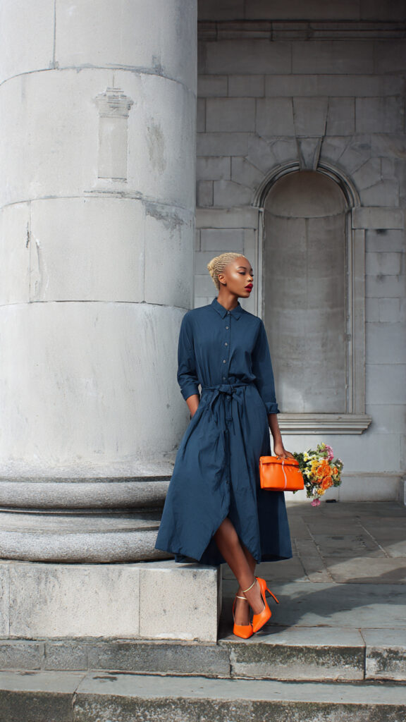 A loose-fit shirt dress worn fully buttoned or layered over pants creates endless styling options. Belts help define shape if you want.