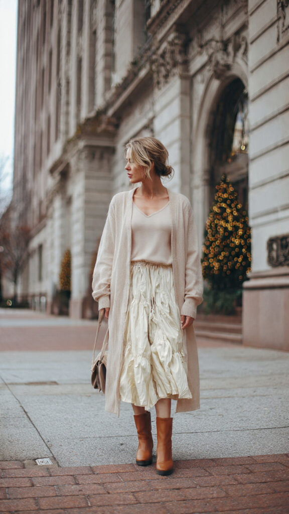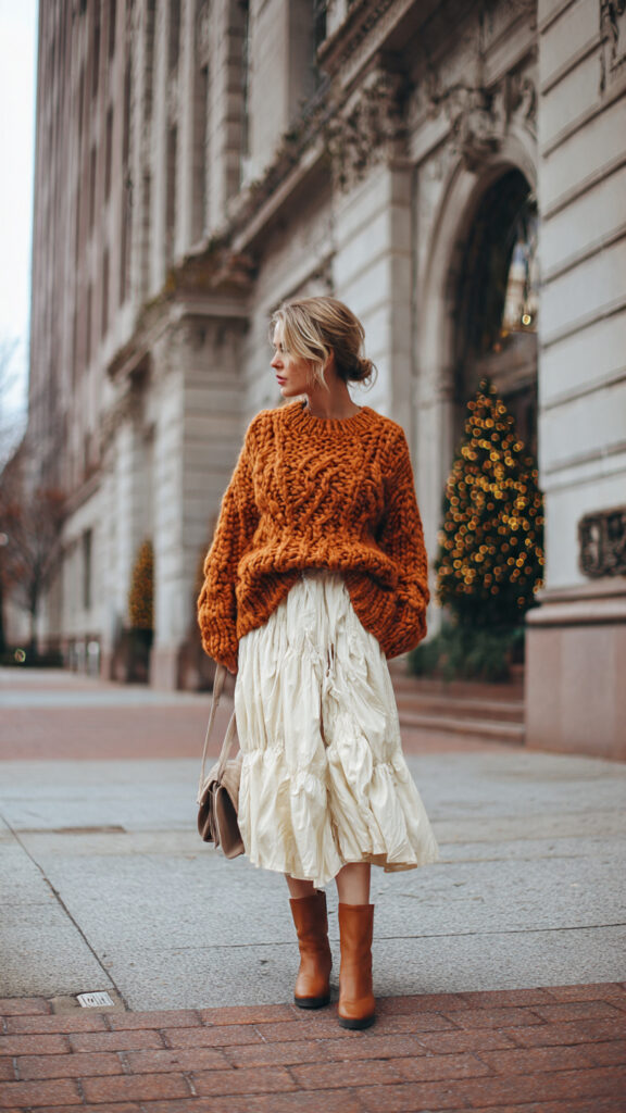 A flowy midi skirt paired with a chunky knit sweater balances proportions beautifully. The coverage feels effortless.