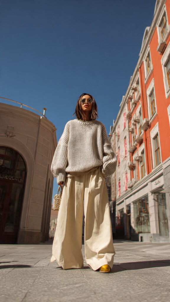 An oversized knit sweater paired with wide-leg trousers creates balance and coverage while still feeling modern. The loose structure works magic here.