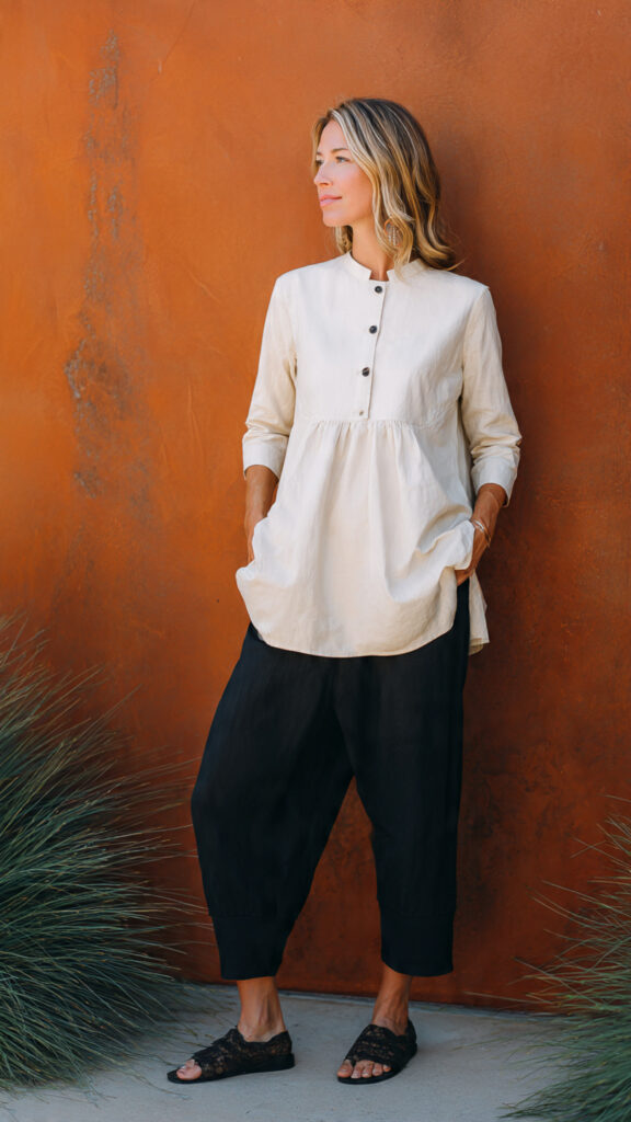 A long tunic-style top paired with relaxed-fit pants creates an easy silhouette that doesn’t cling or restrict.
