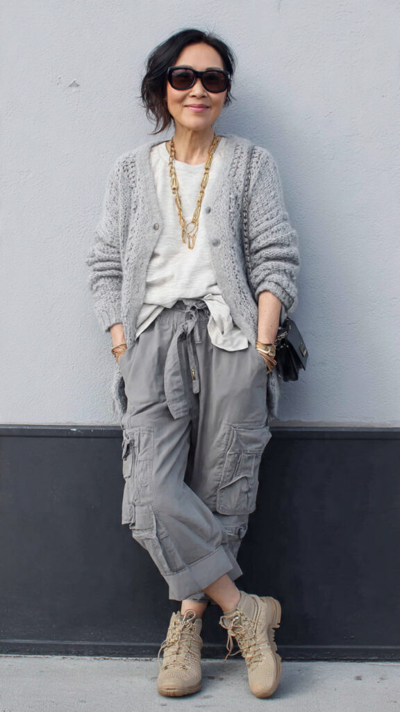 Wide-leg grey trousers plus a matching knit look expensive without effort.
