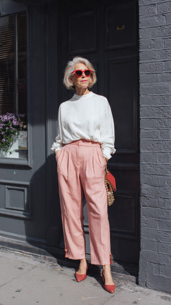 Keep the top half calm—beige, sand, soft camel—then let your pants steal the show.