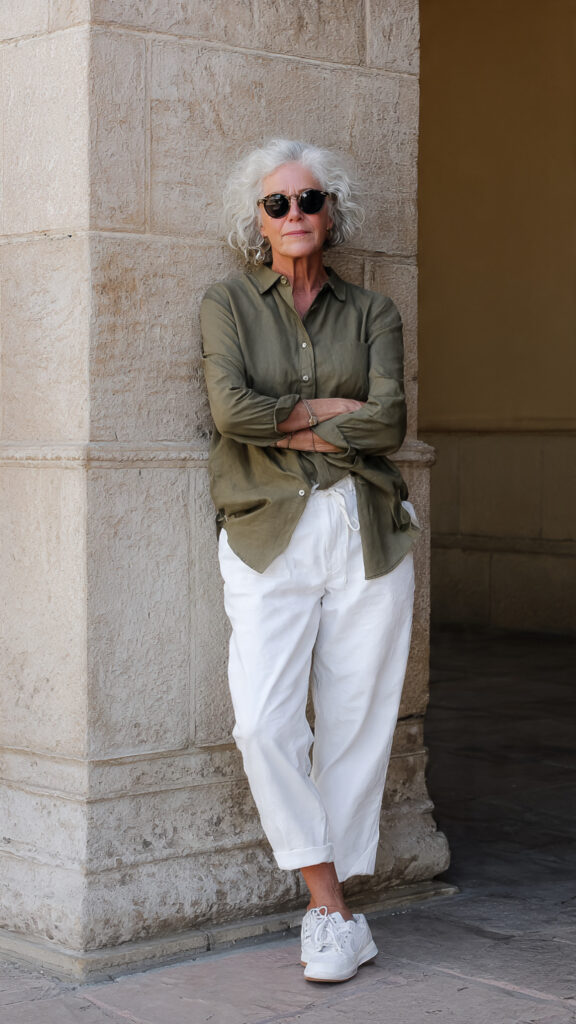 🌿 Khaki Shirt & White Trousers