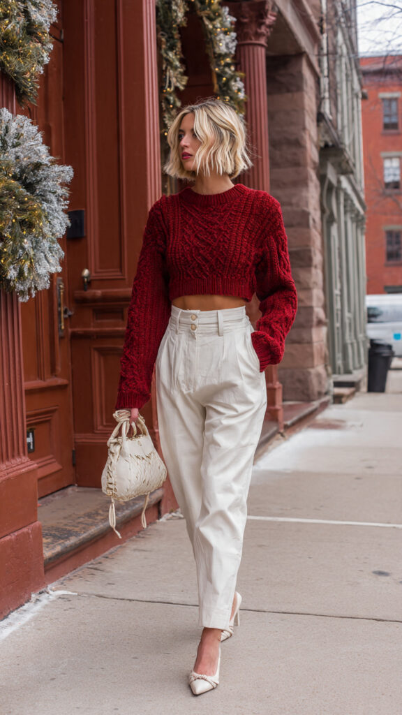 This is peak cozy without sacrificing height. A cropped sweater keeps your waist visible, while straight-leg pants lengthen your lower half.