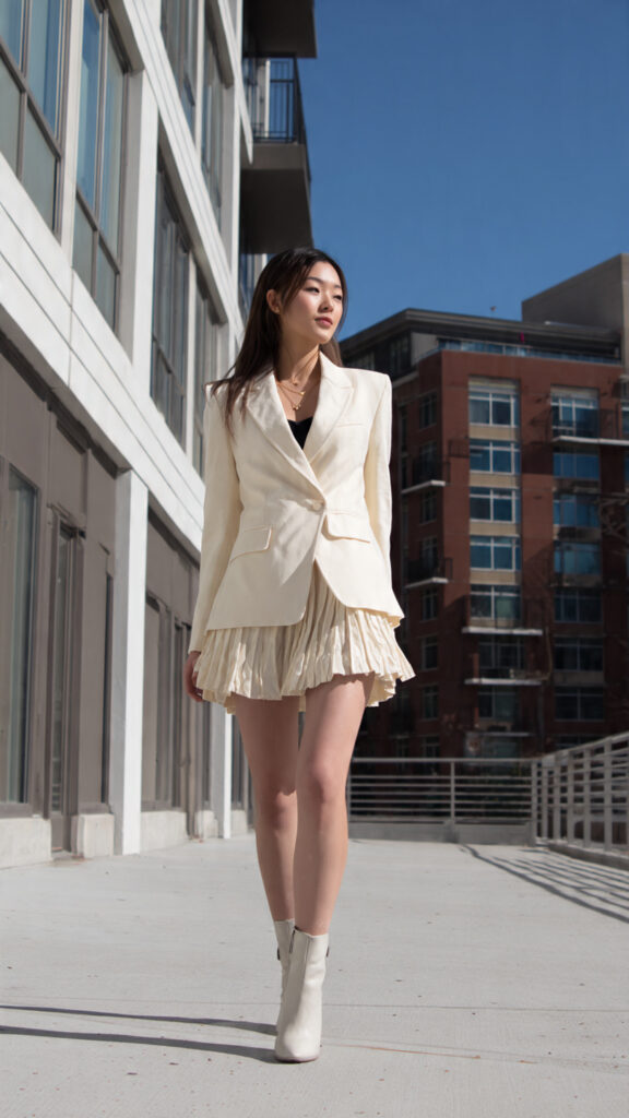 Tailoring matters more than height. A structured blazer sharpens your frame, while a mini skirt shows enough leg to balance it out.