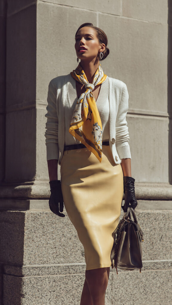 …but styled in smarter, more interesting ways. Layering feels intentional, not bulky. A pop of red under a printed shirt. Colorful leather gloves. A silk scarf that does all the talking.